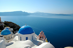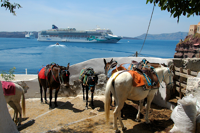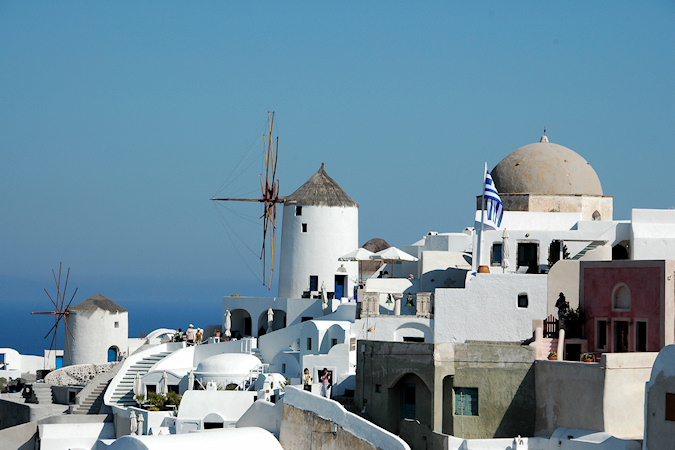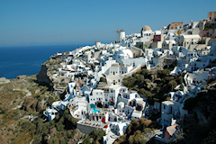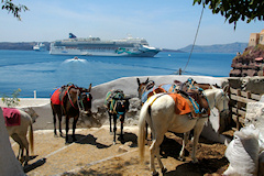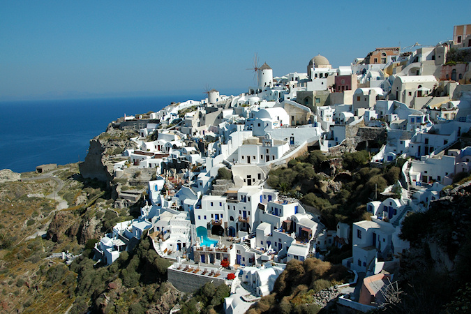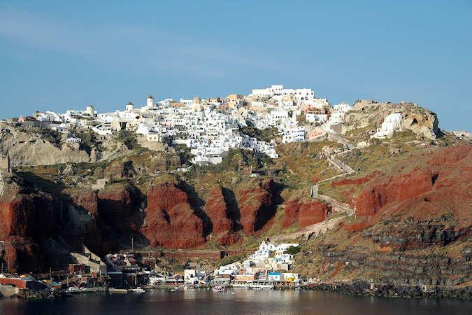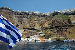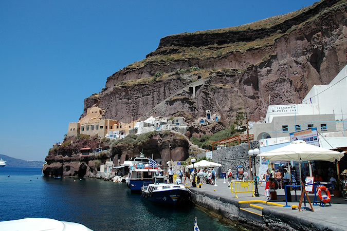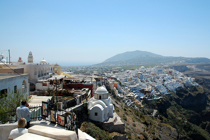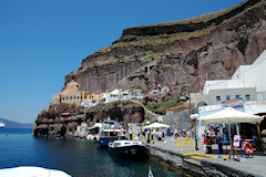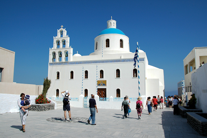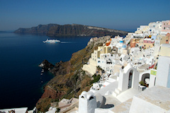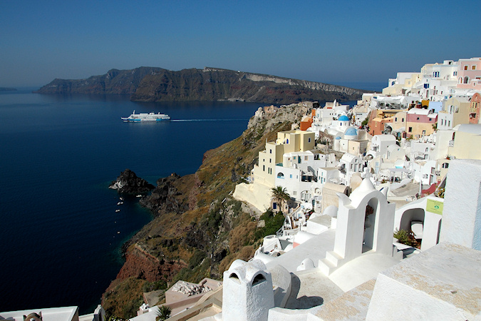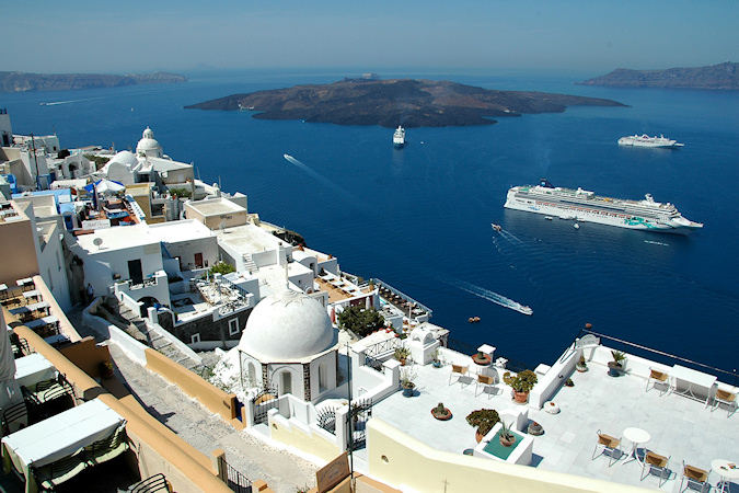 Viides vierailukohde oli Santorinin saariryhmä ja sen suurin saari Thera. Santorinin viidestä saaresta Thera on huomattavasti suurempi kuin muut yhteensä. Santorini on toimiva tulivuori, ei tosin kovin aktiivinen, viimeisimmästä purkauksesta on jo kymmeniä vuosia. Historiassa tapahtuneet purkaukset ovat muuttaneet saarta monta kertaa. Erittäin voimakas tulivuoren purkaus noin 3500 vuotta sitten räjäytti saaren osiin ja tässä yhteydessä uskottu syntyneen valtavan tsunamin on arveltu olleen mahdollinen syy Kreetan, risteilyn edellisen kohteen, muinaisen Minolaisen kulttuurin tuhoon. Santorinilla suurille laivoille ei ole satamaa, joten retkelle lähdettiin yhteysaluksella pieneen Athiniosin satamaan, josta saarta kierrelleen Oian kaupunkiin ja retki päättyi Firaan kaupunkiin. Firaan tutustumisen jälkeen sai haluamallaan tavalla laskeutua alas tunnettua jyrkkää tulivuoren kraatterin seinämää, takasin meren ääreen, joko kävellen tai muulin selässä 588 porrasta tai sitten helpommin köysirataa pitkin. Santorinin kuvaukselliset maisemat olivat ehdottomasti tämän matkan hienoimmat ja jyrkillä rinteillä olevat rakennukset, niiden kattokupolit sekä kellot ovatkin usein kuvissa kun Kreikkalaista maisemaa esitetään. Oia Fira